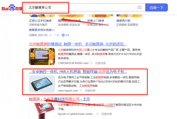 我們公司與北京*為電子有限公司合作中,對這個公司所經營的觸摸屏這個行業提供了百度排名,與該公司的合作,更多的客戶讓我們公司為其提供百度快照排名,通過每一次合作,我們公司不斷完善自己,同時希望合作伙伴在經營的路上越來越好。
