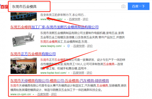 我們公司與東莞市天倬模具有限公司合作中,對這個公司所經營的五金模具這個行業提供了百度快照排名,與該公司的合作,更多的客戶讓我們公司為其提供百度快照排名,通過每一次合作,我們公司不斷完善自己,同時希望合作伙伴在經營的路上越來越好。