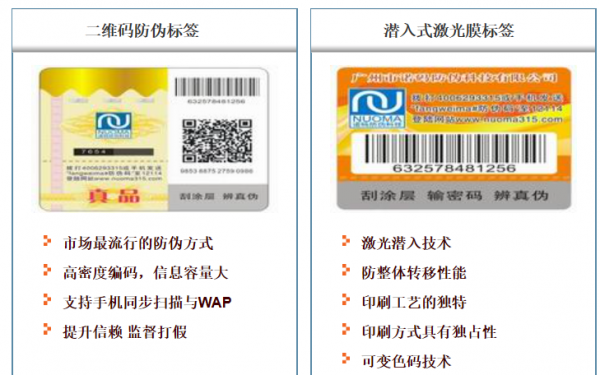 廣州市諾碼防偽科技有限公司是專業從事企業信息化產品研發、生產和銷售的高新技術企業。作為國內電碼防偽行業的開拓者、市場引領者和整體解決方案的倡導者,經過近十年的精耕細作,我們建立了覆蓋全國的市場銷售和技術服務體系,開發了系列化的中高端防偽產品,以難仿制、易識別的獨占性技術,經受住了市場的嚴酷考驗,獲得了名優企業的廣泛認同和信任。目前,已有各行各業近千家處于領導地位的跨國公司和國內知名企業選擇使用了我公司的信息化防偽、防竄貨和會員積分管理解決方案和服務。