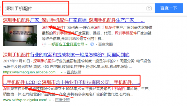 深圳龍豐偉業(yè)電子科技有限公司選用我司企業(yè)手機(jī)配件的網(wǎng)站優(yōu)化產(chǎn)品,其SEO關(guān)鍵詞有手機(jī)配件。搜索品牌詞,首頁至少霸占5條,通過營(yíng)銷型網(wǎng)站、媒體文章、口碑等方式,達(dá)到全方位霸屏,全面展示企業(yè)實(shí)力。深圳龍豐偉業(yè)電子科技有限公司成立于1998年,是經(jīng)深圳市市場(chǎng)監(jiān)督管理局審核的有資質(zhì)的公司,其統(tǒng)一社會(huì)信用代碼:914403007741047867。公司地址:廣東省深圳市福田區(qū)華強(qiáng)北路康樂大廈五樓556A室。