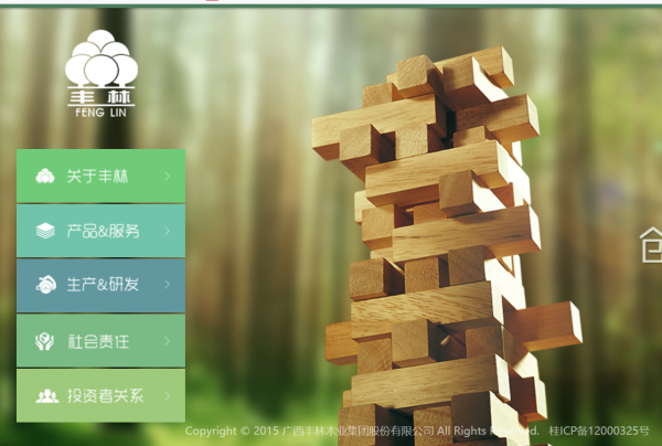 豐林木業(yè)集團股份有限公司(以下簡稱“公司”或“本公司”)是香港豐林國際有限公司董事長劉一川先生創(chuàng)始的一家中外合資股份有限公司,是廣西的一家國內A股上市企業(yè),公司股票簡稱“豐林集團”,股票代碼601996。公司是“國家高新技術企業(yè)、國家林業(yè)重點龍頭企業(yè)和農業(yè)產業(yè)化國家重點龍頭企業(yè)”,獲得35項國家專利,是國內智能精造技術綠色環(huán)保企業(yè)。公司于2010年被中國經濟觀察報評為“2010年度中國最佳低碳企業(yè)評選”20強,在當時的中國人造板行業(yè)極為少見。近年來,公司屢獲“中國林業(yè)產業(yè)突出貢獻獎”、“中國最佳低碳企業(yè)”、“中國林業(yè)重點龍頭企業(yè)”、“中國板材行業(yè)最具影響力(品牌)制造企業(yè)”、“中國國際林業(yè)產業(yè)博覽會金獎”等多項殊榮,在行業(yè)和市場上樹立了良好的品牌形象。2017年,公司產品獲得中國林產工業(yè)協(xié)會的“精品人造板”與廣西質量技術監(jiān)督局的“廣西名牌”榮譽稱號,集團總經理王高峰先生被中國林產工業(yè)協(xié)會授予“中國林產工業(yè)終身成就獎”。