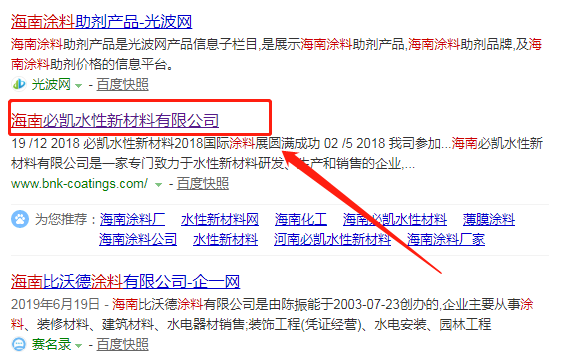 我們公司與海南必凱水性新材料有限公司合作中,對這個公司所經(jīng)營的涂料這個行業(yè)提供了SEO推廣,同時讓我們積累到更多的經(jīng)驗,與海南必凱水性新材料有限公司建立了友好的合作伙伴的關系,也提高了海洋網(wǎng)絡在同行業(yè)的知名度,提高了海南必凱水性新材料有限公司在同行業(yè)的知名度,發(fā)展越來越好。