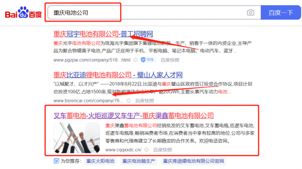 我們公司與重慶渠*蓄電池有限公司合作中,對這個公司所經營的電池這個行業提供了快速排名,與該公司的合作,更多的客戶讓我們公司為其提供快速排名,通過每一次合作,我們公司不斷完善自己,同時希望合作伙伴在經營的路上越來越好。