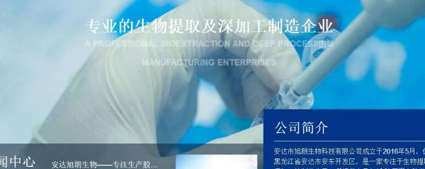安達(dá)市旭*生物科技有限公司成立于2016年5月,位于黑龍江省安達(dá)市安東開發(fā)區(qū),是一家專注于生物提取及深加工的制造公司。取得膠原蛋白肽、骨膠原蛋白肽、酶解骨粉及小麥低聚肽、玉 米低聚肽粉、大豆肽粉等產(chǎn)品的生產(chǎn)許可。 企業(yè)已經(jīng)申請(qǐng)數(shù)項(xiàng)發(fā)明專利,已獲批一項(xiàng)。