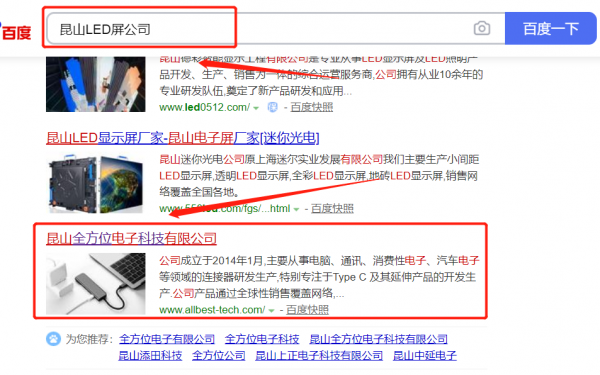 昆山*方位電子科技有限公司選用我司企業LED屏的網站優化產品,其SEO關鍵詞有LED屏。搜索品牌詞,首頁至少霸占5條,通過營銷型網站、媒體文章、口碑等方式,達到全方位霸屏,全面展示企業實力。昆山*方位電子科技有限公司成立于2014年,是經昆山市市場監督管理局審核的有資質的公司,其統一社會信用代碼:91320583**9390710F。公司地址:江蘇省昆山市玉山鎮水秀路1258號2號房。