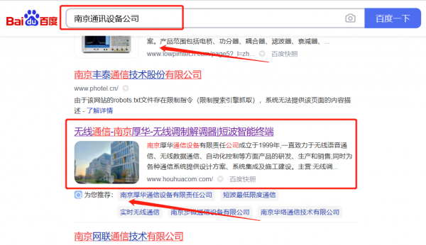 我們公司與南京厚*通信設備有限責任公司合作中,對這個公司所經營的通訊設備這個行業提供了萬詞霸屏,與該公司的合作,更多的客戶讓我們公司為其提供SEO優化,通過每一次合作,我們公司不斷完善自己,同時希望合作伙伴在經營的路上越來越好。