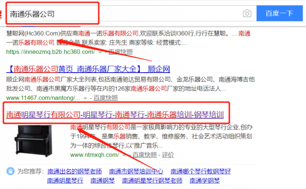 我們公司與南通明星琴行有限公司合作中,對這個公司所經營的樂器這個行業提供了百度快照排名,與該公司的合作,更多的客戶讓我們公司為其提供百度快照排名,通過每一次合作,我們公司不斷完善自己,同時希望合作伙伴在經營的路上越來越好。