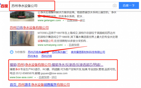 耀 星(蘇州)凈水設備有限公司選用我司企業凈水設備的網站優化產品,其SEO關鍵詞有凈水設備。不管是PC、還是移動端、微信或B2B行業平臺,做到網絡推廣無死角,全方位覆蓋。根據用戶的意圖和行為數據,精準用戶畫像,識別每一位用戶真實需求及興趣愛好,實現最大化廣告效果。耀 星(蘇州)凈水設備有限公司成立于2013年,是經蘇州市市場監督管理局審核的有資質的公司,其統一社會信用代碼:91320594084445698R。公司地址:江蘇省蘇州工業園區宏業路158號聯發工業園10號樓2、3樓。