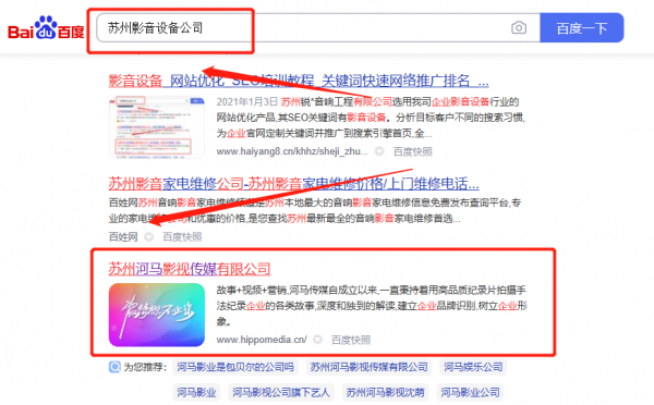 我們公司與蘇州河*影視傳媒有限公司合作中,對這個公司所經營的影音設備這個行業提供了網絡營銷,與該公司的合作,更多的客戶讓我們公司為其提供關鍵詞搜索排名,通過每一次合作,我們公司不斷完善自己,同時希望合作伙伴在經營的路上越來越好。