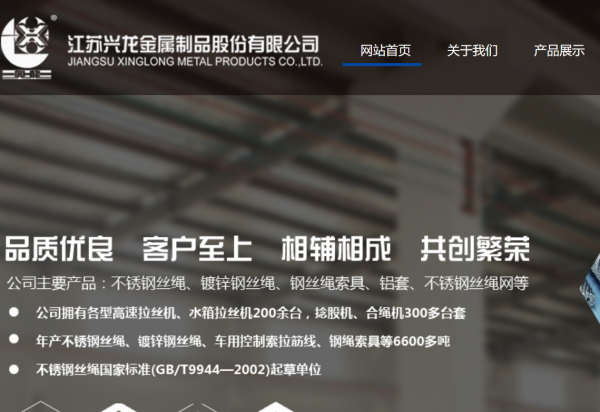 江蘇興龍金屬制品股份有限公司地處于“中國不銹鋼名鎮(zhèn)”——江蘇省興化市戴南鎮(zhèn),創(chuàng)立于1985年,一直從事各類鋼絲繩及鋼絲繩制品的研制、生產(chǎn)與銷售。現(xiàn)有員工420人.工廠占地面積86500平方米。公司擁有各型高速拉絲機(jī)、水箱拉絲機(jī)200余臺,捻股機(jī)、合繩機(jī)300多臺套。年產(chǎn)不銹鋼絲繩、鍍鋅鋼絲繩、車用控制索拉筋線、鋼繩索具等6600多噸。廣泛應(yīng)用于港口碼頭、建筑裝璜、農(nóng)林石化、漁業(yè)、汽車、醫(yī)療器械等行業(yè)是國內(nèi)規(guī)模較大、品種較全的不銹鋼絲繩及鋼絲繩索具生產(chǎn)基地。002年取得自營出口權(quán)資格,產(chǎn)品70%出口海外,遠(yuǎn)銷美國、英國、意大利、德國、日本、韓國、西班牙、澳大利亞、南非、印度等國家。