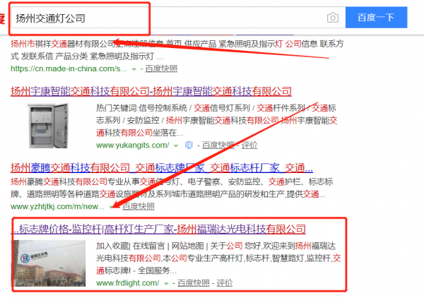 我們公司與揚州福瑞達光電科技有限公司合作中,對這個公司所經營的交通燈這個行業提供了百度快照排名,與該公司的合作,更多的客戶讓我們公司為其提供百度快照排名,通過每一次合作,我們公司不斷完善自己,同時希望合作伙伴在經營的路上越來越好。