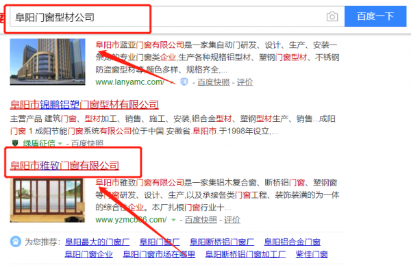 我們公司與阜陽市雅致門窗有限公司合作中,對這個公司所經營的門窗型材這個行業提供了快速排名,與該公司的合作,更多的客戶讓我們公司為其提供快速排名,通過每一次合作,我們公司不斷完善自己,同時希望合作伙伴在經營的路上越來越好。