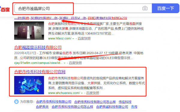 合肥市*秀科技有限公司選用我司企業液晶屏行業的網站優化產品,其SEO關鍵詞有液晶屏。分析目標客戶不同的搜索習慣,為企業官網定制關鍵詞并推廣到搜索引擎首頁,全面鎖定每一個目標客戶,使客戶瞬間找到你。合肥市*秀科技有限公司成立于2013年,是經合肥市市場監督管理局審核的有資質的公司,其統一社會信用代碼:91340100**0311449B。公司地址:安徽省合肥市蜀山區經濟開發區湖光路自主創新產業基地三期(南區)B座13層1301室。