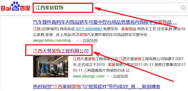 我們公司與江西天譽裝飾工程有限公司合作中,對這個公司所經(jīng)營的家居軟飾這個行業(yè)提供了百度快照排名,與該公司的合作,更多的客戶讓我們公司為其提供百度快照排名,通過每一次合作,我們公司不斷完善自己,同時希望合作伙伴在經(jīng)營的路上越來越好。