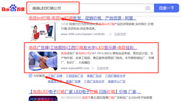 我們公司與南昌佳*廣告有限公司合作中,對這個公司所經營的LED燈箱這個行業提供了百度關鍵詞排名,與該公司的合作,更多的客戶讓我們公司為其提供SEO推廣,通過每一次合作,我們公司不斷完善自己,同時希望合作伙伴在經營的路上越來越好。