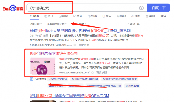 鄭州創*界光學眼鏡有限公司網站排名快上詞效果展示